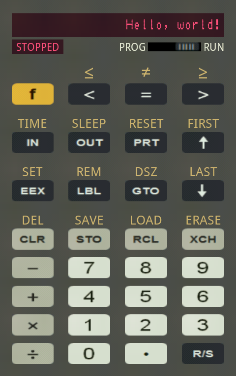 The Programmable Calculator app has two displays: the larger main display and the smaller status display. The main display is where you see program steps as well as program and manual calculation results. For instance, "Hello, world!" in the sample program above will be displayed in the main display. The status display shows one of three states the calculator is in: STOPPED, RUNNING, and INPUT .